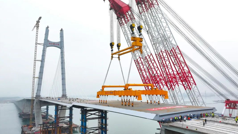 3月30日上午10時02分 隨著最后一塊鋼箱梁成功吊裝到位 陽江港大橋順利合龍 如一條巨龍橫臥海面 標志著廣東省濱海公路 海陵大堤段至溪頭段實現(xiàn)全線貫通 向通車目標邁出了重要一步! 陽江港大橋全長4777.2米 是廣東濱海旅游公路陽江海陵大堤 至溪頭段公路項目的控制性工程 由保利長大工程有限公司承建 巨力索具負責該項目鋼箱梁吊具制作 鋼箱梁采用大節(jié)段吊裝方案,分6個節(jié)段 最大梁段長90米,最小梁段長74.5米