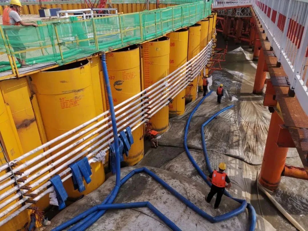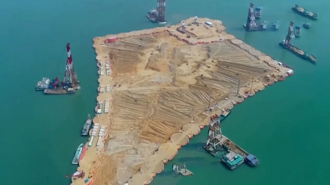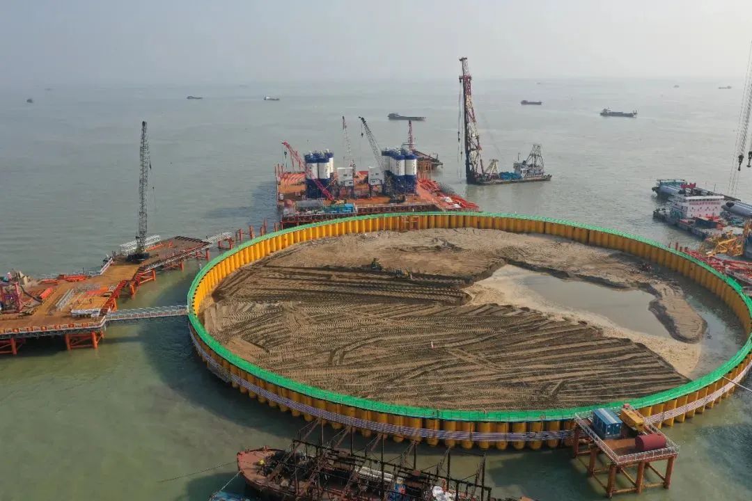 2017年9月18日,隨著最后一根鋼圓筒振沉到位,57個鋼圓筒,每個直徑28米、高35-40米,重達(dá)650噸全部精準(zhǔn)牢固地打入海底巖層中。西人工島外圈圍堰如珠玉般勾勒出“海上鯤鵬”。僅用4個半月,在寬闊的伶仃洋中間,憑空筑起一座相當(dāng)于19個足球場大小的人工島,刷新了快速成島的世界紀(jì)錄。