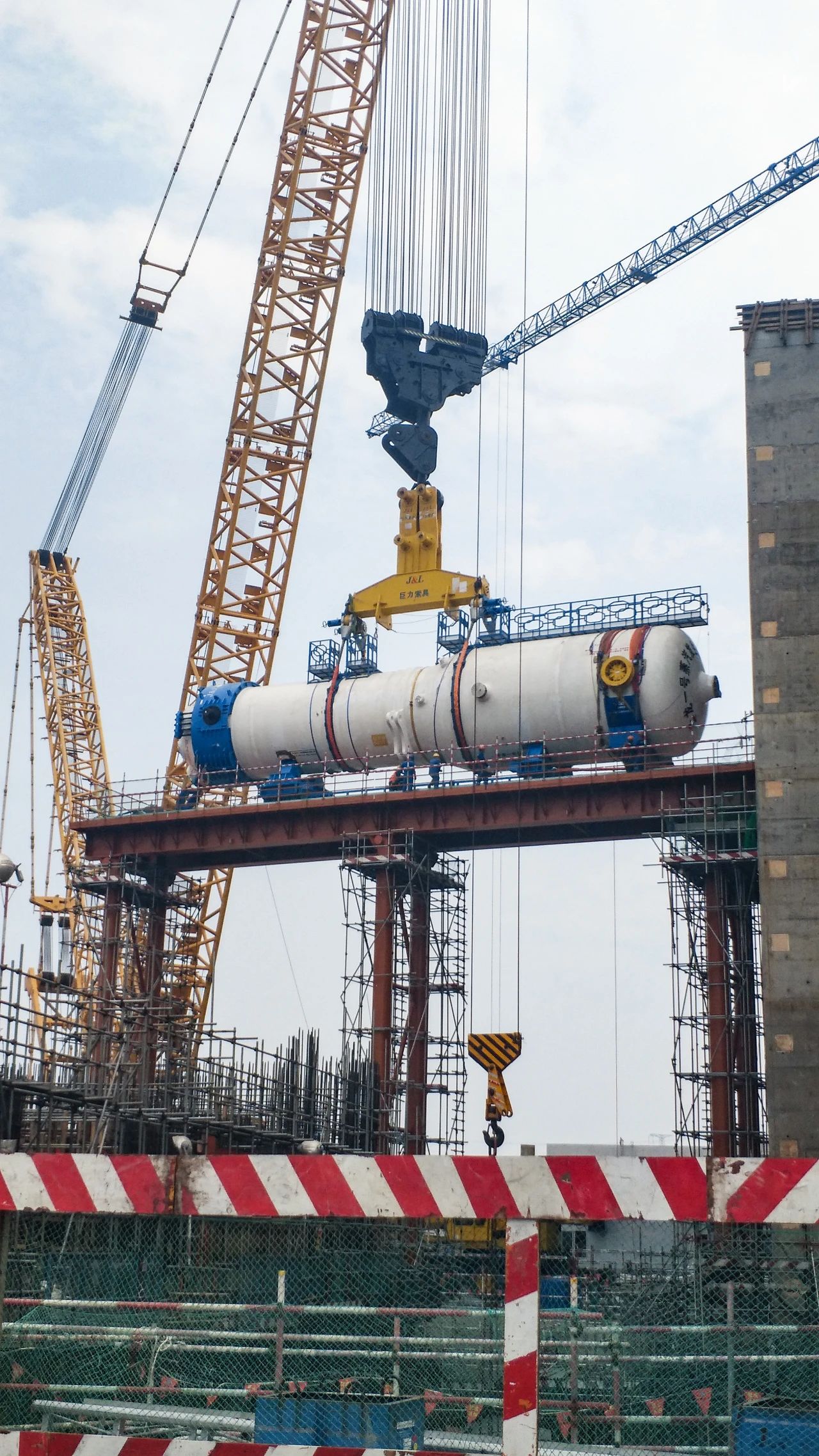 2022年8月,“華龍一號”漳州核電2號機(jī)組穩(wěn)壓器通過“主設(shè)備預(yù)引入法”順利吊裝就位,巨力索具通過項(xiàng)目現(xiàn)場移動(dòng)式翻轉(zhuǎn)支座、翻轉(zhuǎn)抱環(huán)、拉緊裝置,提供吊桿及吊梁等翻轉(zhuǎn)吊裝產(chǎn)品,使用3200t吊車在反應(yīng)堆廠房外翻轉(zhuǎn)、吊裝引入至穩(wěn)壓器間,全程保障項(xiàng)目吊裝順利進(jìn)行。