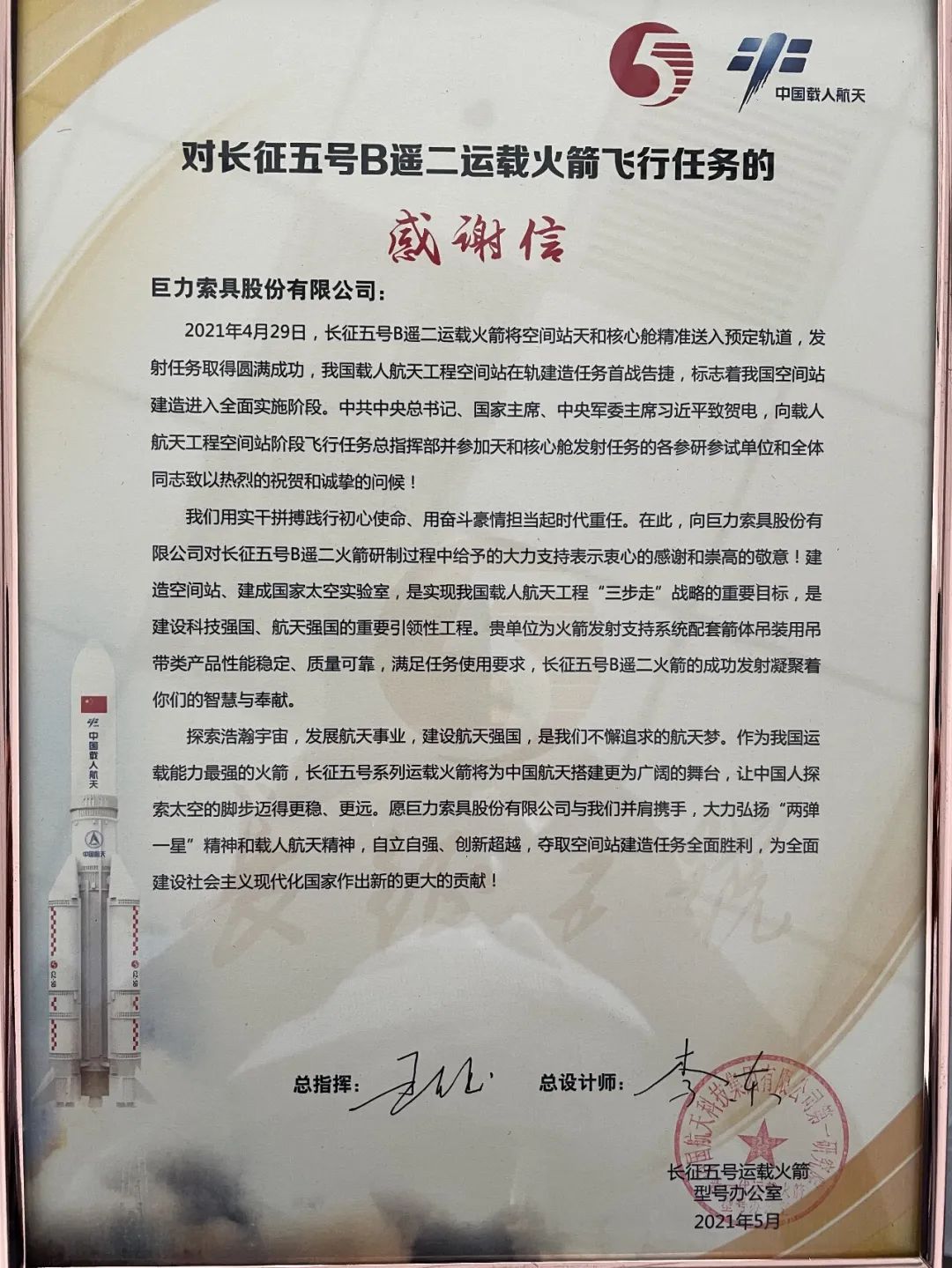 日前,巨力索具股份有限公司收到中國航天科技集團(tuán)第一研究院發(fā)來的感謝信,向巨力索具對長征五號B遙二運(yùn)載火箭飛行任務(wù)和研制過程中給予的大力支持表示衷心的感謝。