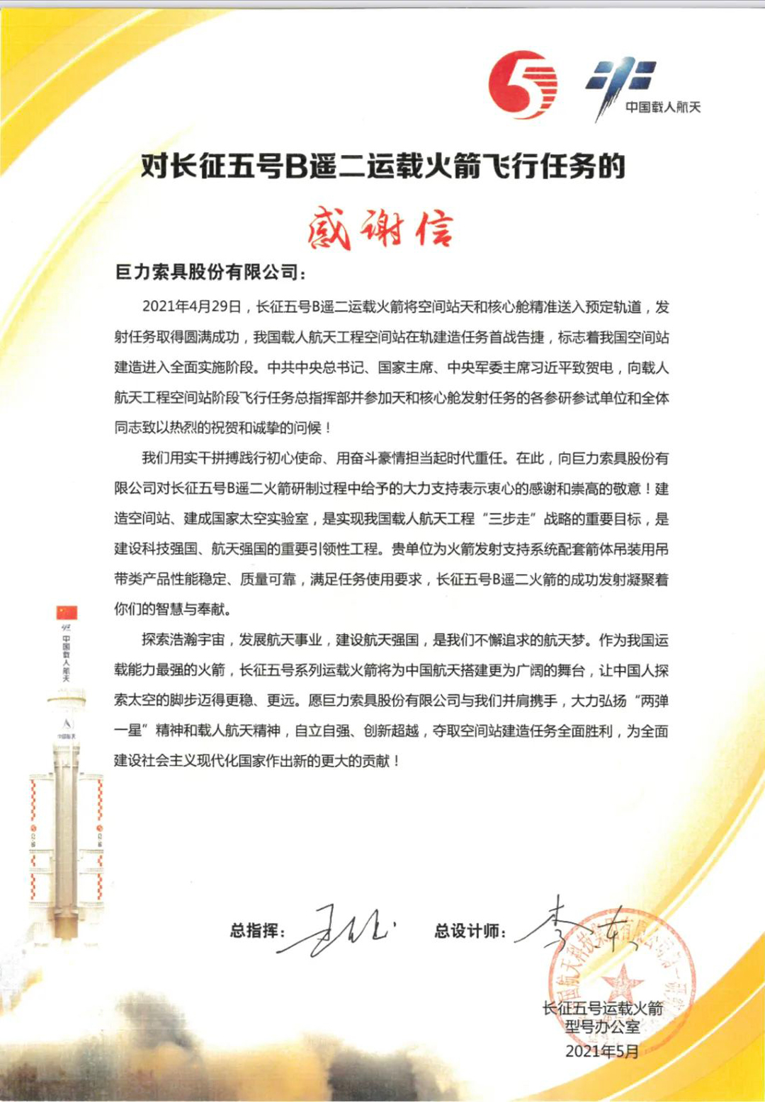 座談會上,雙方就航天產(chǎn)品的吊裝方案、未來大型火箭的吊裝、吊具的通用化設(shè)計以及無吊點吊裝等智能化設(shè)備進行討論。巨力索具憑借多次為神舟飛船系列、嫦娥系列、長征運載火箭系列、天宮系列、天問系列提供定制吊裝產(chǎn)品及吊裝方案的實踐經(jīng)驗給予專業(yè)答復。首都航天表示感謝并對巨力索具在航天領(lǐng)域的專業(yè)性、創(chuàng)新性表示認可。