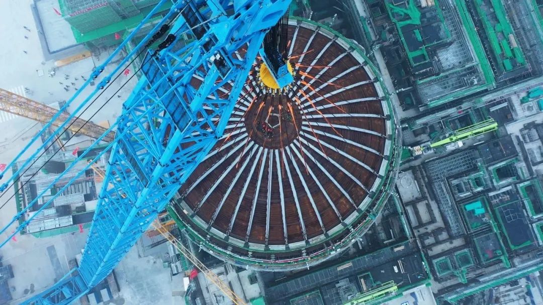 吊裝過程中,穹頂宛如一個巨型“帽子”,它是保證反應(yīng)堆廠房安全殼完整性和密封性的重要組成部分。據(jù)了解,本次穹頂?shù)跹b呈現(xiàn)整體吊、物項多、總重大、精度高等特點,包含鋼襯里結(jié)構(gòu)以及支撐籠架、部分鋼筋和預(yù)應(yīng)力導(dǎo)管、全部貫穿件、加強板、內(nèi)部鋼結(jié)構(gòu)、設(shè)備支吊架、噴淋系統(tǒng)、照明系統(tǒng)、消氫裝置、換熱器設(shè)備、探測設(shè)備等設(shè)備,總重量為739.016噸。
